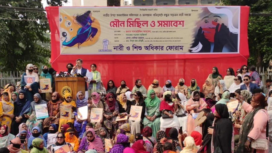 নারী ও শিশু অধিকার ফোরামের আয়োজিত এ সমাবেশ শেষে মুখে কালো কাপড় বেঁধে শাহবাগ থেকে একটি মৌন মিছিল কেন্দ্রীয় শহীদ মিনারে গিয়ে শেষ হয়।